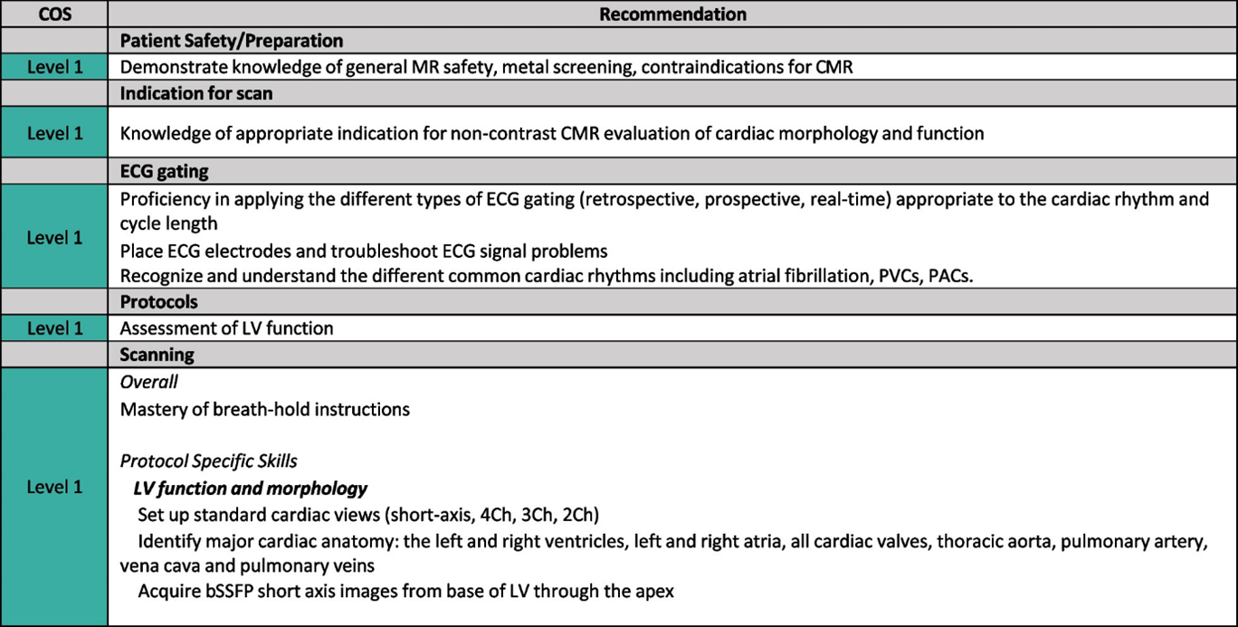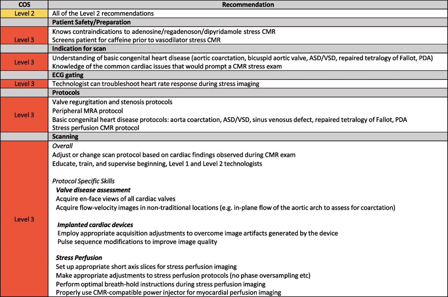 This CMR training should be conducted under the supervision of a Level 3 physician and/or technologist. As these CMR scans are inherently more complex, the CMR technologist will need a more advanced knowledge of cardiac anatomy and physiology, in addition to possessing a solid understanding of the interplay of different CMR sequence parameters that govern temporal and spatial resolution, SNR, and scan duration. The CMR technologist with Level 3 skills should be able to adjust or change the scan protocol based on cardiac findings observed during the CMR exam. The Level 3 technologist should be able to provide preliminary findings of the CMR exam to the attending physician. It is recommended that at least 300 CMR exams are needed to acquire Level 3 CMR skills. Although the length of time needed to achieve Level 3 skills may vary by center CMR volume, 6 months of CMR imaging is recommended. See additional recommendations below.
