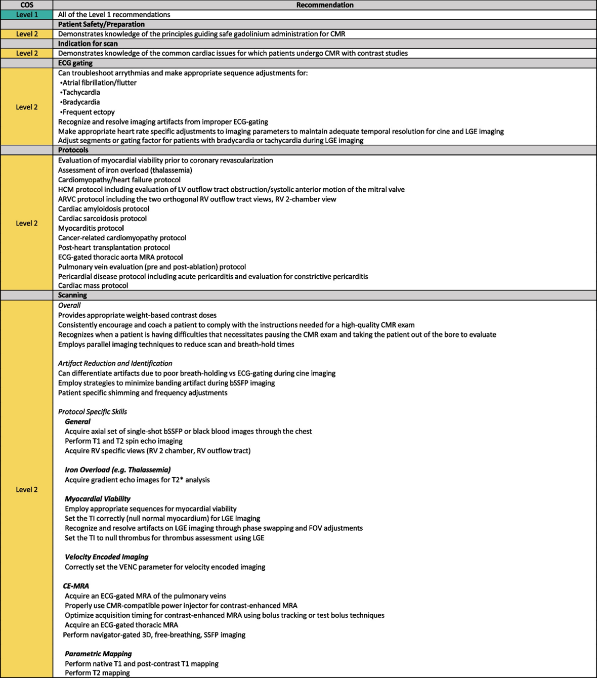 This CMR training should be conducted under the supervision of a Level 2 or Level 3 (preferred) physician and/or technologist. CMR technologist with Level 2 skills can be expected to perform post-contrast examinations, including myocardial viability, assessment of heart failure and infiltrative cardiomyopathies, hypertrophic cardiomyopathy, myocarditis, arrhythmogenic cardiomyopathy, pericardial disease and assessment of cardiac masses. As this level of competency is significantly broader than Level 1, it is recommended that performing at least 150 CMR exams is needed to acquire Level 2 CMR skills. Although the length of time needed to achieve Level 2 skills may vary by center CMR volume, 4 months of CMR imaging is recommended. See additional recommendations below.